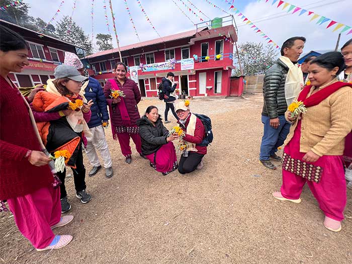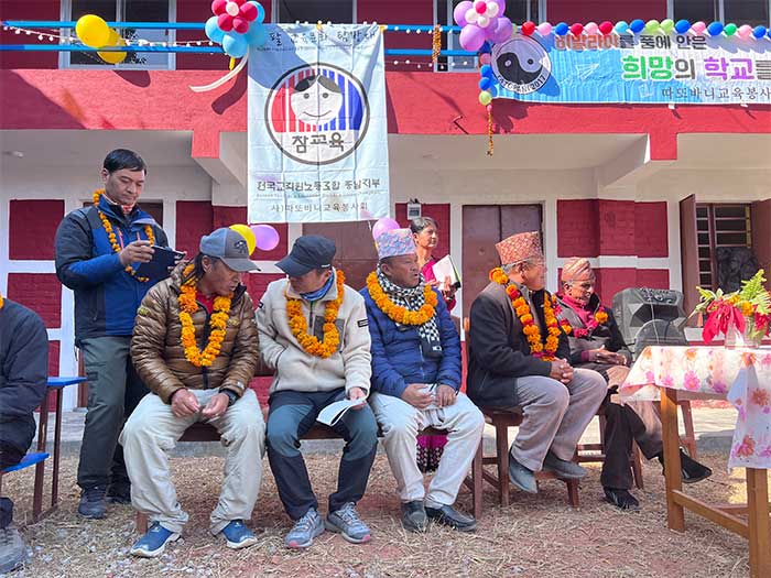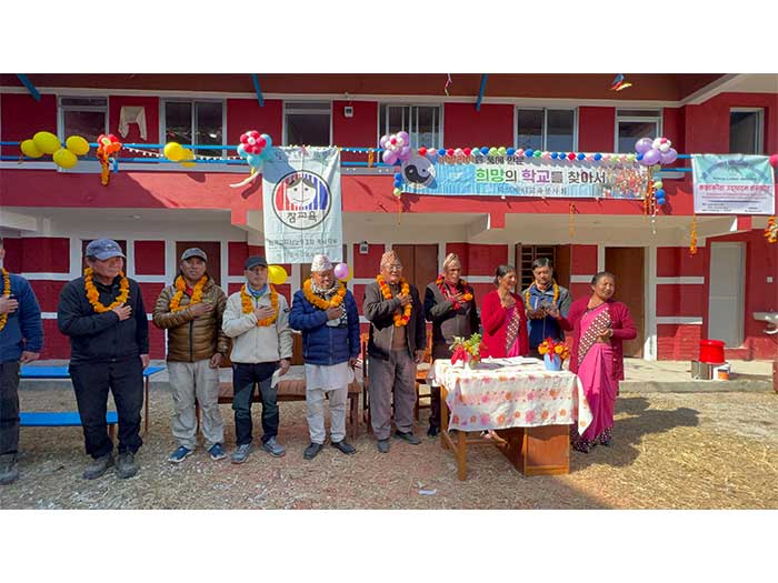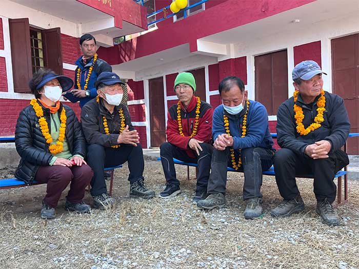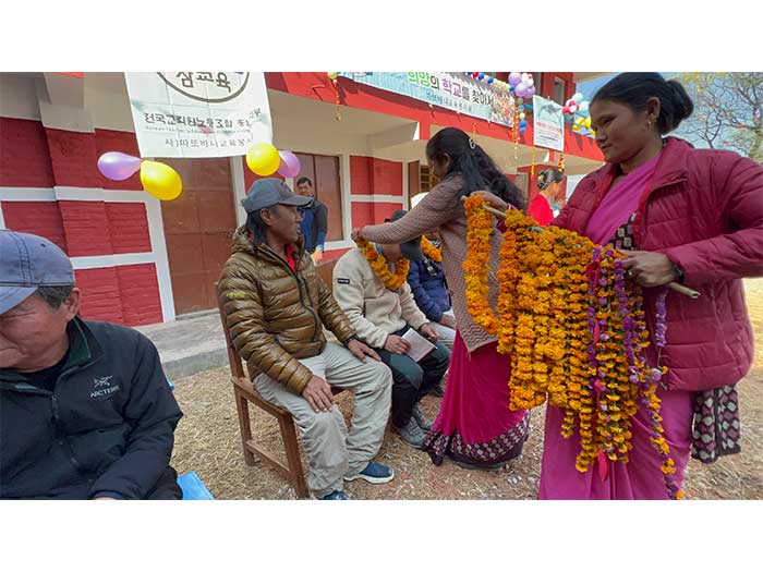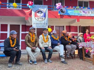 By January 15, 2023, the construction project was successfully completed and officially handed over to the responsible persons at Shree Jana Prabhat Primary School. A special ceremony was held to mark this significant milestone. During the ceremony, Serap Jangbu Sherpa, the founder of the Serap Lee Foundation, and Mr. Le se Jung, the founder of Tatopani Education Service Cooperation from South Korea, were warmly welcomed with traditional flower garlands. The event was attended by the donors and the entire team from Tatopani Education Service Cooperation.