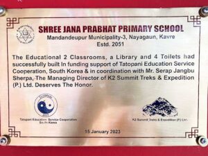 On December 15, 2022, Serap Jangbu Sherpa, alongside the Tatopani Education Service Cooperation team from South Korea, which included donors, visited the Shree Jana Prabhat Primary School. The purpose of their visit was to monitor the progress of a construction project funded by their generous donations. The funds were specifically allocated for the construction of a second floor in one of the school buildings. This new addition included three additional classrooms, two toilets, and a shower facility, significantly enhancing the school’s infrastructure.